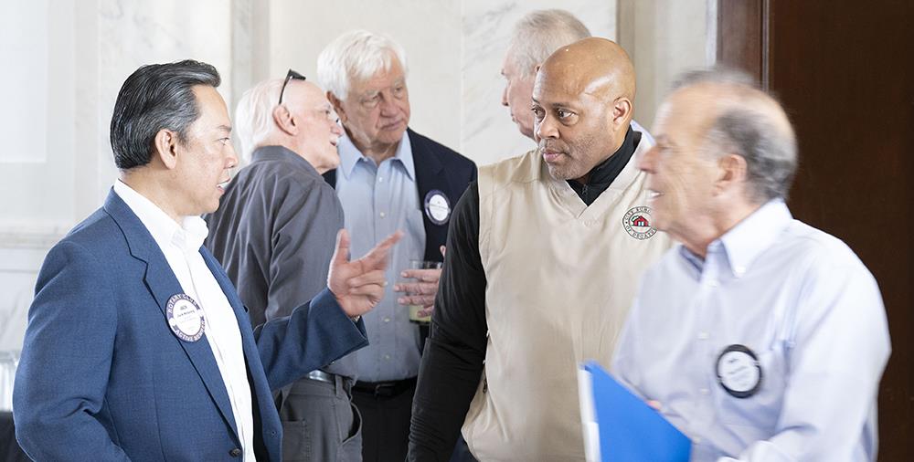 Jack Kirivong and Rick Garnitz greet welcome visitor Jarvis Adams (center)